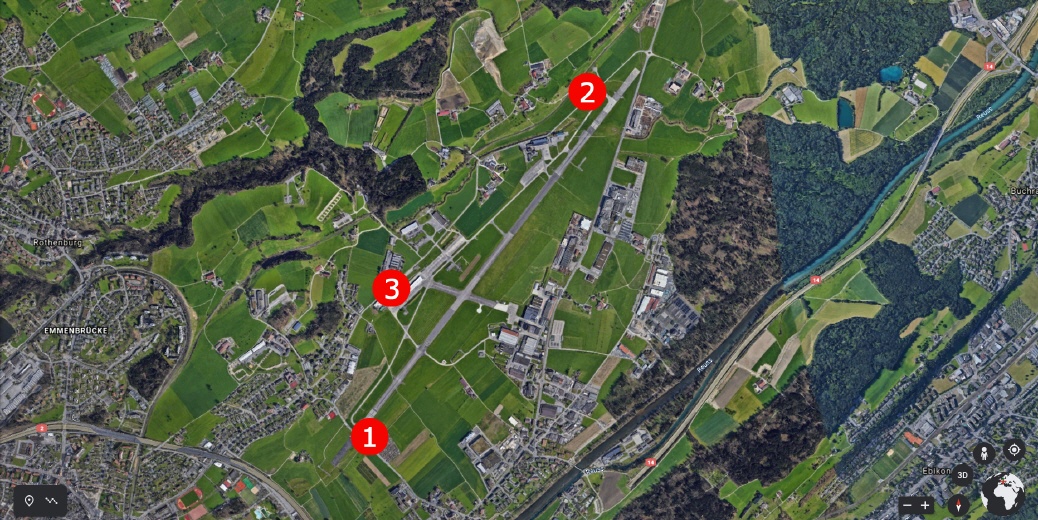 Emmen: Dient als Stützpunkt für Schulungs- und Wartungsarbeiten. Es beherbergt häufig verschiedene Flugzeuge zur Pilotenausbildung. Koordinaten: 47°05'27"N 8°17'51"E