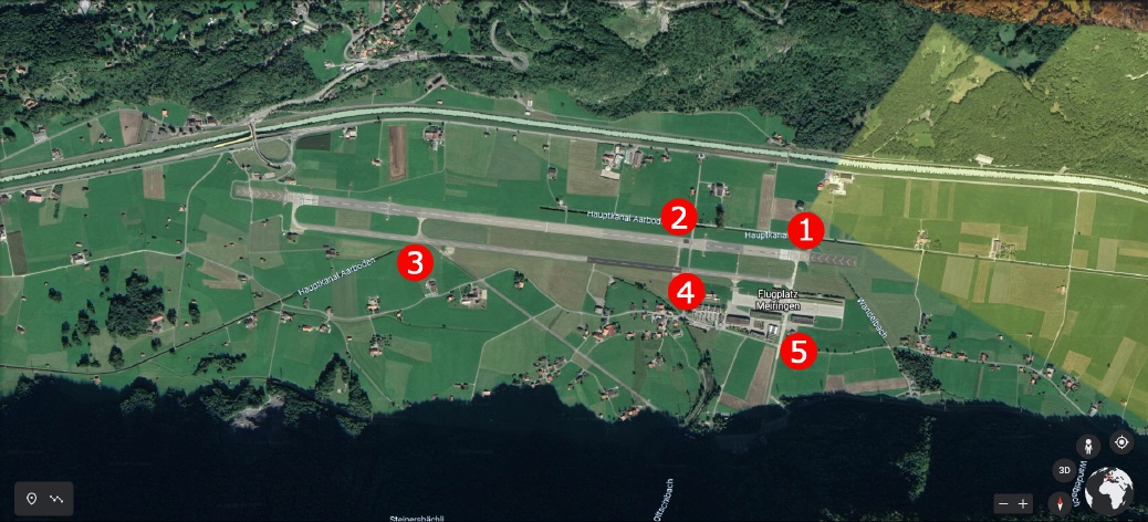 Meiringen: Bekannt für seine einzigartige Lage in einem Tal und seine unterirdischen Hangars. Es beherbergt auch F/A-18 Hornets. Koordinaten: 46°44'25"N 8°07'04"E